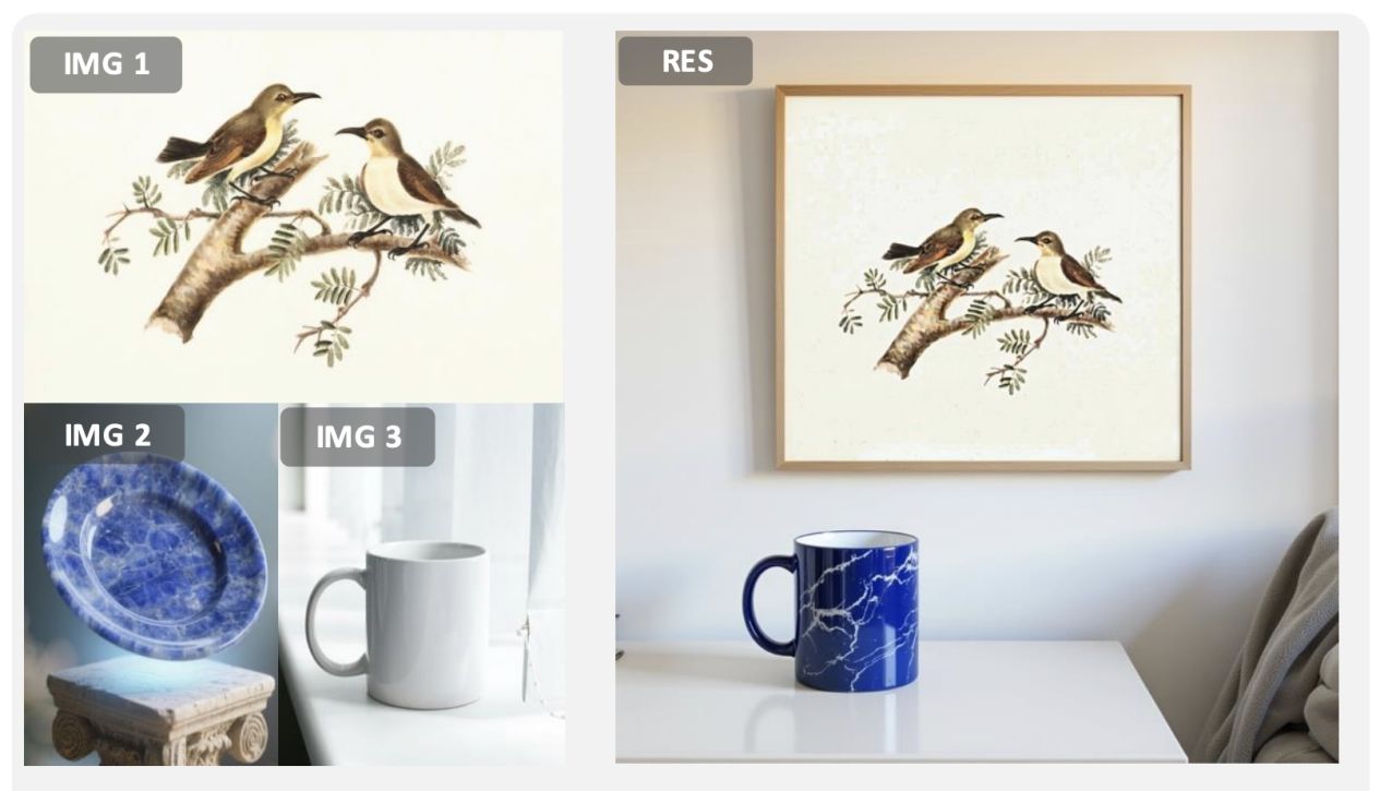 在多模態指令生成任務中,DreamOmni2能基於圖片中的實體進行圖像生成,例如提取圖一的畫作掛在臥室牆上,將圖二盤子的材質套用在圖三的水杯,並將水杯放置在桌子上,以生成符合用家要求的新圖像。