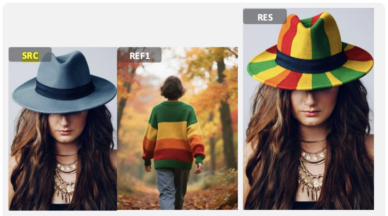 在多模態指令編輯任務中,DreamOmni2的表現亦非常優秀,例如將圖中帽子的顏色變成與另一張圖毛衣相同的配色。